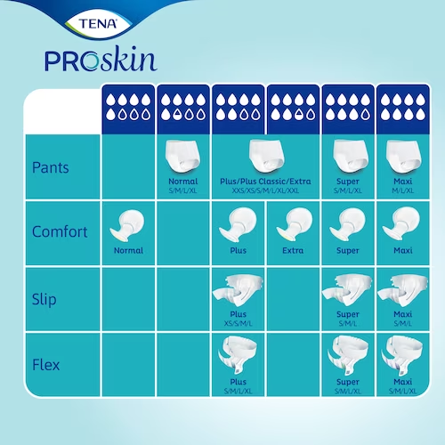 Das Gleiche gilt für alle Slips, Hosen und Flex-Produkte. Sie alle haben eine höhere Saugfähigkeit. Wiederum Begriffe wie Leicht, Normal, Plus oder Zahlen wie 5 oder 6 für leichtere Produkte. Die schwereren Modelle heißen Super, Maxi und Ultima.